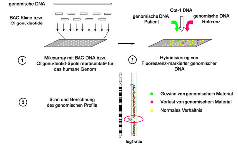 Bei der Array-CGH Methode (Comparative Genomic Hybridisation) wird durch Hybridisierung von Patienten DNA auf einem Träger („Chip“) mit rasterförmig angeordneten DNA-Fragmenten (BAC-Klone) eine komplexe Diagnostik ermöglicht.